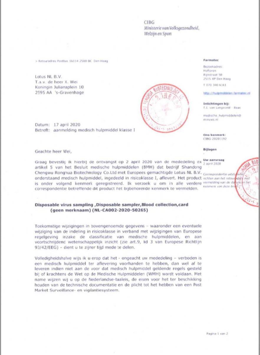 4月19日,我公司產(chǎn)品新冠病毒采樣管、基因檢測采樣器、采血卡等產(chǎn)品順利在荷蘭藥監(jiān)局完成注冊。從此我公司打開了出口業(yè)務(wù)的大門,產(chǎn)品銷售將邁上一個更高的臺階。歡迎有做醫(yī)療器械產(chǎn)品出口業(yè)務(wù)的貿(mào)易公司垂詢400-996-2688